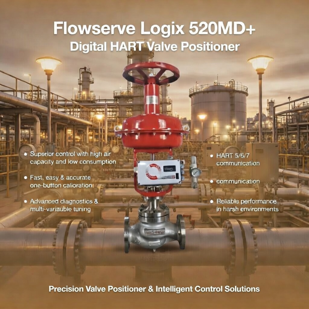 The Flowserve Logix 520MD is a digital positioner built for pneumatic control valves. It combines HART communication with piezo technology for accurate positioning and easy maintenance. The local interface allows quick setup without special tools, making it practical for plants looking for dependable performance in standard process environments.
